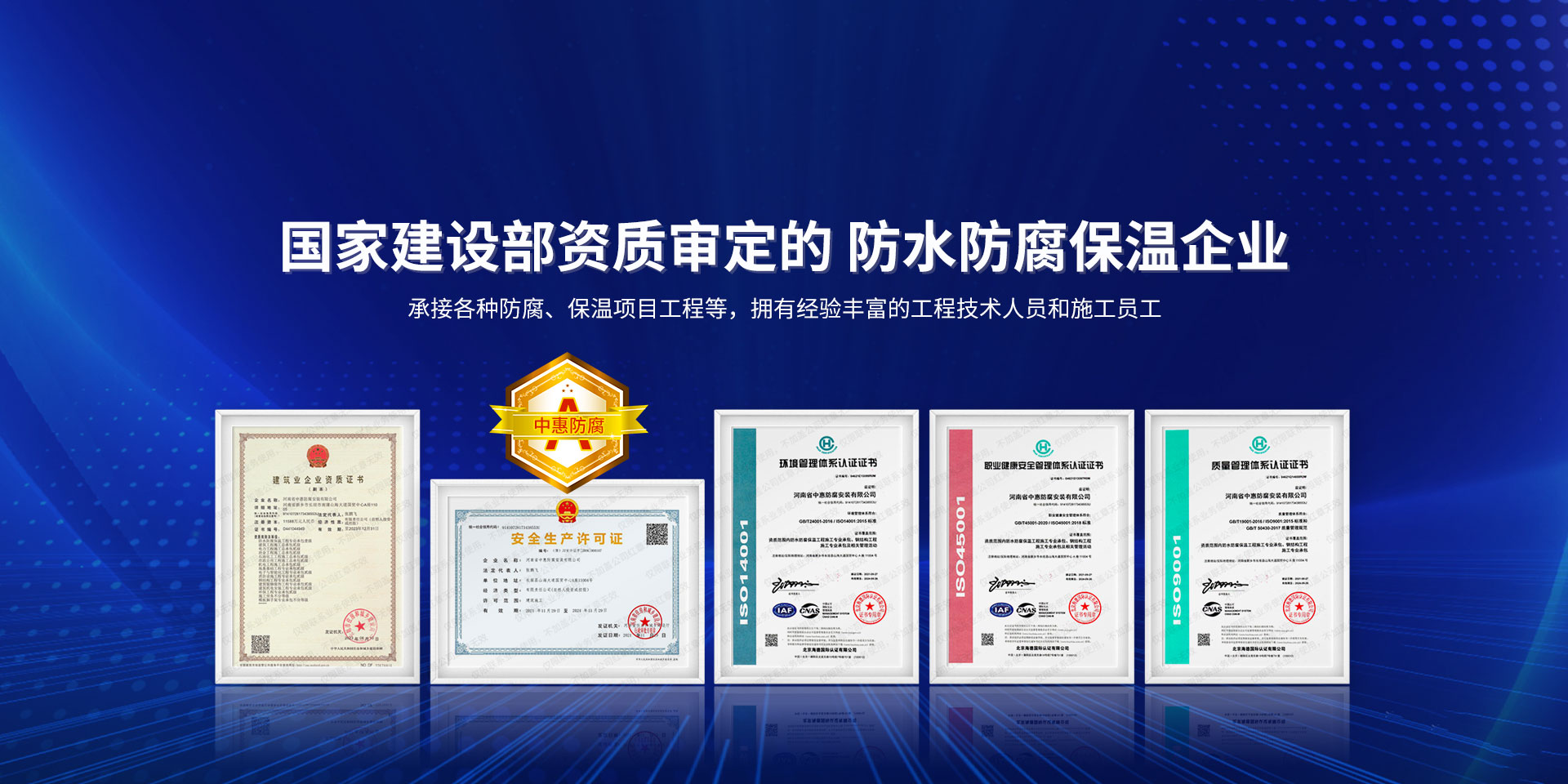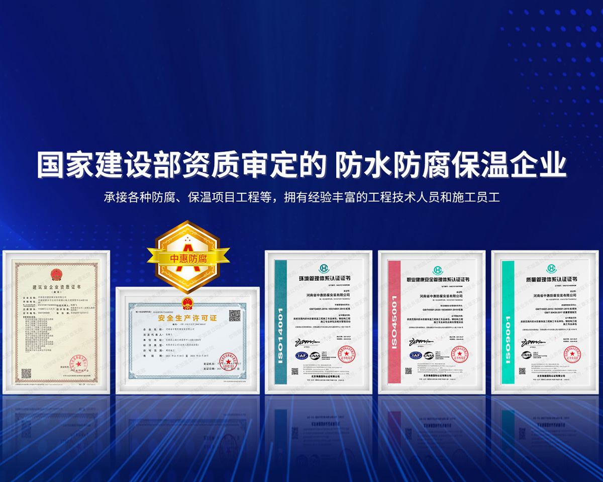 公司經營范圍:防水防腐保溫工程;消防設施工程;建筑裝修裝飾工程;建筑機電安裝工程;電力工程;建筑工程;石油化工工程;工業清洗工程;油罐清洗工程;鋼結構工程;環保工程;模板腳手架工程;電纜防火封堵、防污閃噴涂、外墻外保溫工程;各類施工勞務作業;設備維修、船舶鉚焊、涂裝;電力工程材料、建材、防水材料、防火材料、防腐保溫材料銷售,并相繼通過了GB/T19001-2008idtISO9001:2008GB/T50430-2007質量管理體系認證證書。GB/T24001-2004idtISO14001:2004環境管理體系認證證書。GB/T28001-2011idtOHSAS18001:2007職業健康安全管理體系認證證書。公司是中國防腐蝕于防護協會、中國施工企業管理協會、電力協會和中國鋼結構防水協會會員單位?! 」镜慕洜I業務涵蓋了石油、化工、電力、冶金、煤炭、船舶、國防、燃氣、水利、環保、交通運輸、航空及國防軍工和輕紡市政等行業的防腐保溫絕熱設備。鋼結構安裝、防火、防水、金屬噴鍍、聚脲噴繪、陰極保護、防滲透堵漏、玻璃鋼及各種磚版材料襯里、橡膠襯里、煙氣硫和耐酸溶劑腐蝕等工程施工。公司連續十年榮獲“省市先進施工企業”“安全生產先進單位”“重合同,守信用企業”和“AA***資質企業”的稱號。2000年被命名為市級文明單位,2002年被國家工商行政管理局命名為“重合同,守信用的企業”、被中國工業防腐蝕技術協會命名為“防腐蝕企業,能源節約及環境保護領域有豐富的經驗和***的業績。工程一次交驗合格率100%。其中攀枝花鋼鐵公司煉鐵廠四號高爐及熱風爐防腐工程、上海寶鋼公司煤氣柜防腐工程、撫順石油一廠裝置防腐項目、齊魯石化公司稀烴廠高塔防腐工程、吉林化學工業公司煉油廠油罐防腐工程、天津石化熱電廠六號爐頂棚聯絡管保溫工程、大慶油田(太倉)力神泵業工程、中國化學工程第十一建設工程、中原油田勘探局工程、中國石化銷售有限公司華北分部、魯皖輸油管道工程、貴州開磷息烽合成氨工程、陜西黃陵煤化工程、中國石油天然氣西部管道塔里木輸油工程、邯鋼集團邯寶鋼鐵公司煉鐵工程、德州供電工程、吉寶(南通)船廠工程,偃師華潤熱力工程、鄭州熱力總公司。 河南省中惠防腐安裝有限公司愿以豐富的施工經驗,***的技術,***的設備,***的管理,***的服務,竭誠為國內外廣大的用戶提供***滿意、******的工程作品。 我公司愿與國內外同仁一道,團結協作,共同推進防腐蝕行業發展! 公司地址:河南省長垣縣建設路北段360號 固定電話:0373-8866488 郵編:453400 網址:http://www_zhff_com_cn.22bnn.com
